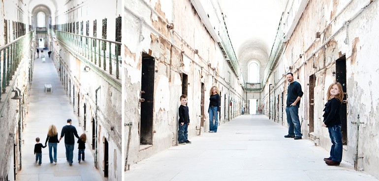 As for the portrait session, it was great!  Chad (the dad) had the great idea of photographing at the Eastern State Penitentiary, a location that I have always been fond of for it’s history and peeling paint/ textured walls.  Jordyn & Luke (the adorable kiddos) were great and I think that they had a lot of fun exploring this creepy space.  Towards the end of our time there we were told that we actually weren’t allowed to photograph there.  Go figure!  Well, at least we got some portraits in before we were reprimanded.