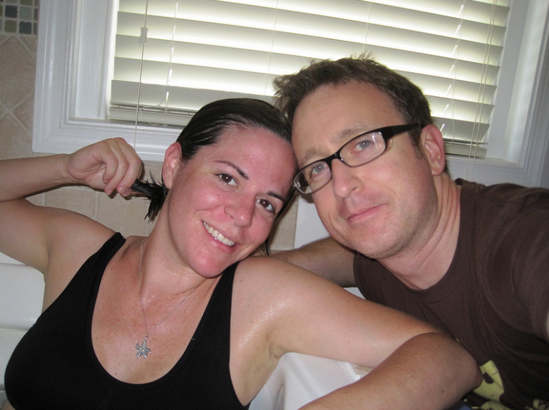 Carl & I between contractions! I’m in the tub… My face is so red!
